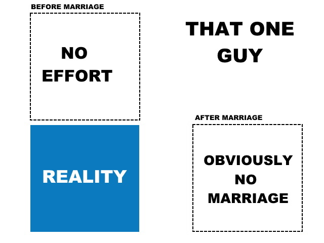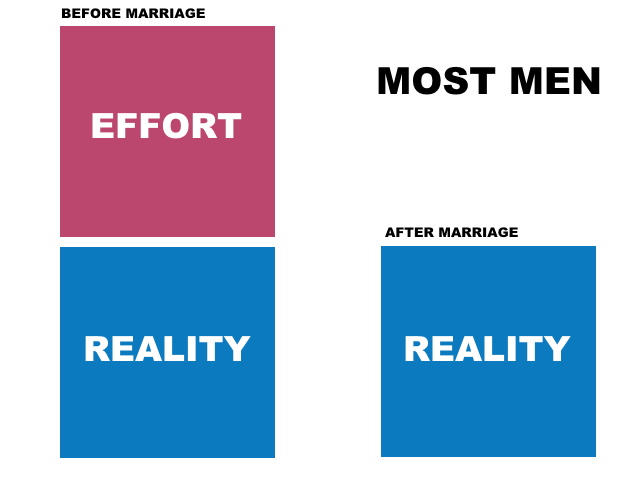 So from the first diagram above, the effort that a man applies before marriage to win a wife often amounts to creating a whole different persona, mimicking the strong character traits that a woman would want. I think that I can safely generalise that many men, if not most men would invest lots of effort in two specific ways: